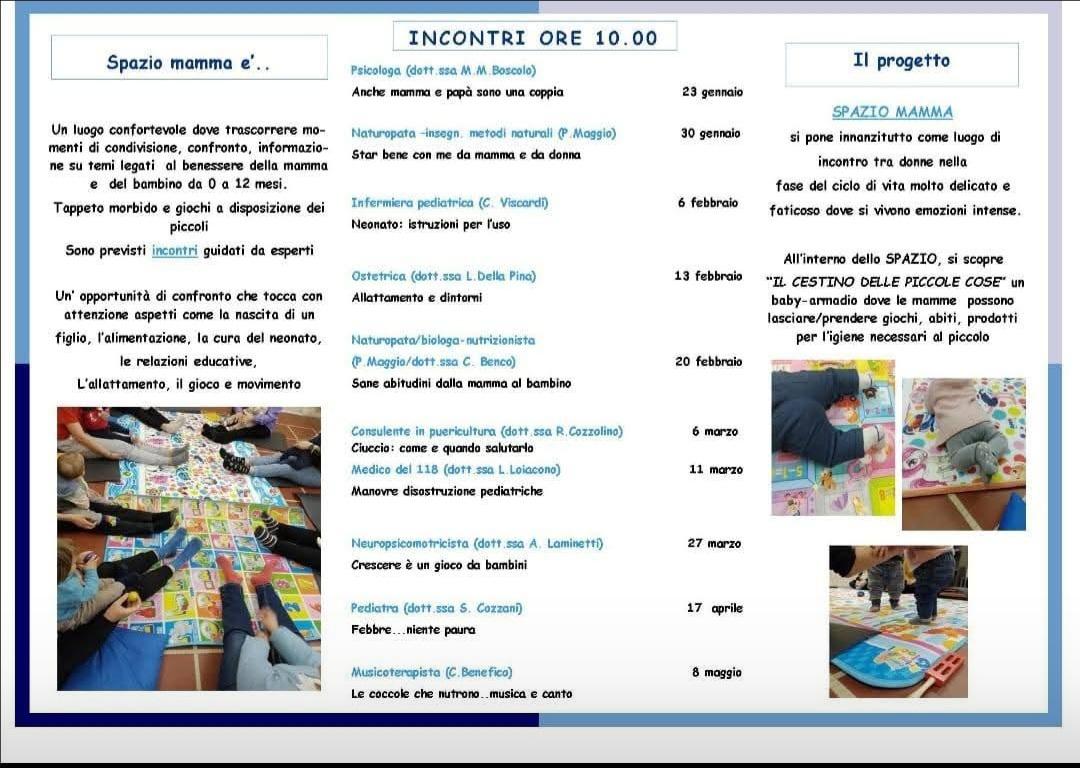 per il mese di gennaio sono previsti appuntamenti il 23 gennaio ore 10 con la psicologa/psicoterapeuta Dott.ssa M.Marta Boscolo con l'incontro “Anche mamma e papà sono una coppia” e il 30 gennaio ore 10 sarà presente Paola Maggio, naturopata e insegnante dei metodi naturali con l'incontro “Star bene con me da mamma e da donna”.