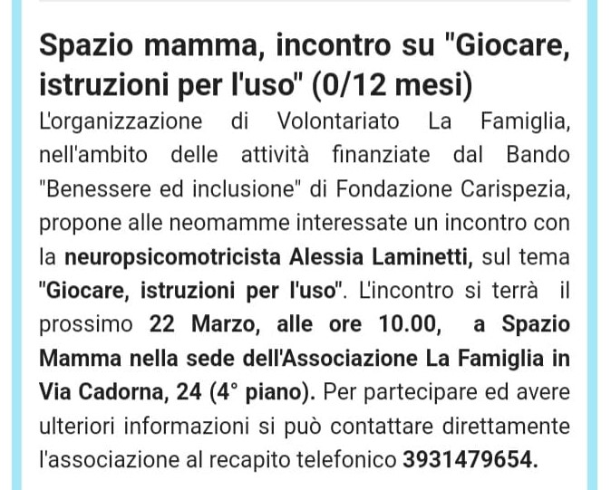 Parlano di noi a VIVERE INSIEME (centro di Servizio per il Volontariato) Sab, 16/03/2024 - 18:10 Allegati 30 Ott, 2025 Comunicati SPAZIO MAMMA..sta per tornare 30 Ott, 2025 News SPAZIO MAMMA . Favole, musica e colori del NATALE 19 Mag, 2025 News Il direttivo regionale incontra l'associazione La Famiglia